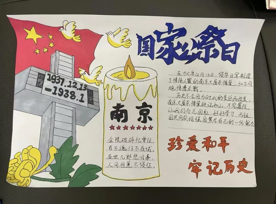 活动中,同学们集中观看历史题材影片,在震撼与悲痛中重温那段山河破碎的岁月;手绘创作现场,大家以笔为媒,将对遇难同胞的缅怀、对和平的珍视融入一幅幅作品里。