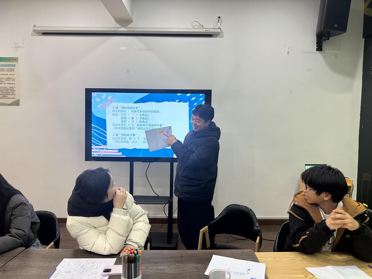 通过短视频的引入,现场的气氛逐渐热了起来。紧接着绘画环节,张睿介绍绘制“情绪云朵”的规则,组织同学们利用A4纸和彩笔,绘出自己的情绪表达图案。张睿通过同学们画出的不同图案,引导大家思考图案表达的意图,探索图案背后的情绪导向,激励良好情绪的延续,协助不良情绪的改善。