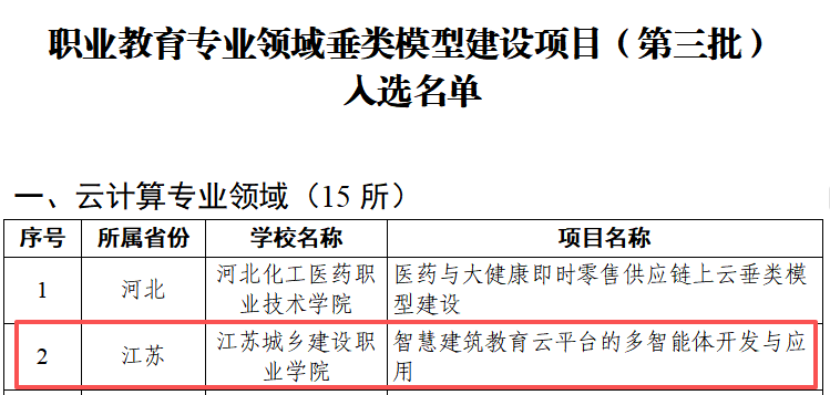 近日,教育部职业教育发展中心公布职业教育专业领域垂类模型建设项目入选名单,我校申报的“智慧建筑教育云平台的多智能体开发与应用”项目成功突围,跻身云计算专业领域建设行列。此次遴选面向全国职业院校,由教育部职业教育发展中心会同阿里云联合组织,经专家严格审核、层层筛选,最终仅15所院校入选,凸显遴选的高规格与严苛性。